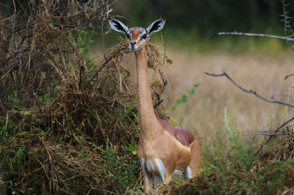 The gerenuk looks like an antelope stretched vertically in an editing program. It has an unusually long neck and slender body. Native to East Africa, it stands upright on its hind legs to reach leaves.